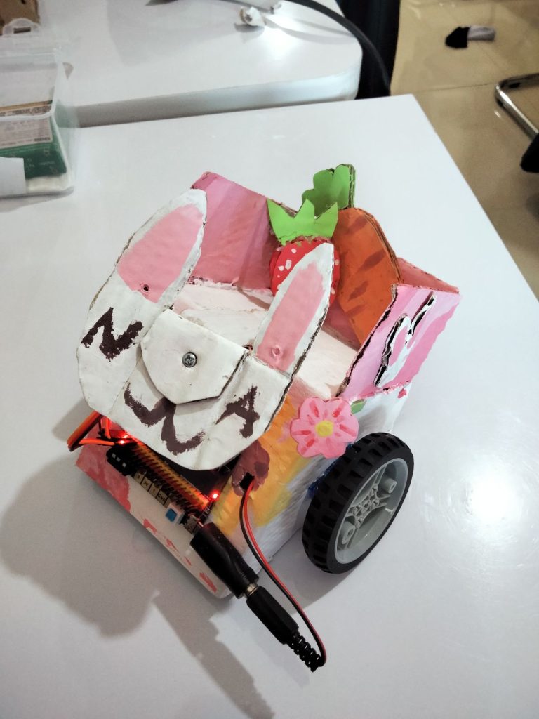 So this is the final project that me and nafisa made. at first we searched on youtube, and we wanted to make a kind of ordinary robot like robots in general. but after we searched again we finally found a kind of rabbit robot. and we decided to make that robot. actually the robot has legs made of cardboard, but we decided not to use it. because we thought it was difficult. in the end we just used the wheels from the miss, then we added some cardboard behind it. in order to add utility to the robot, which can carry some small items.